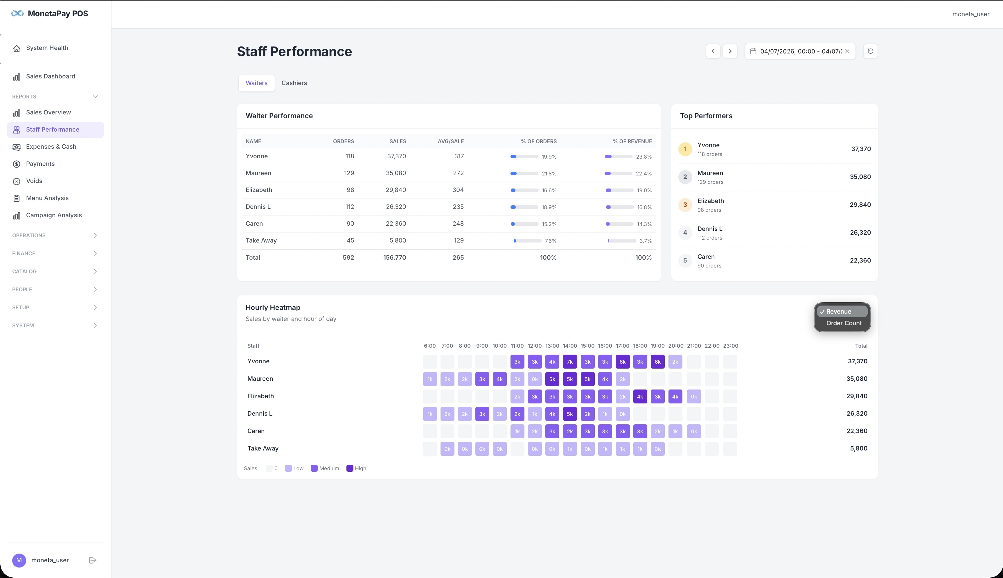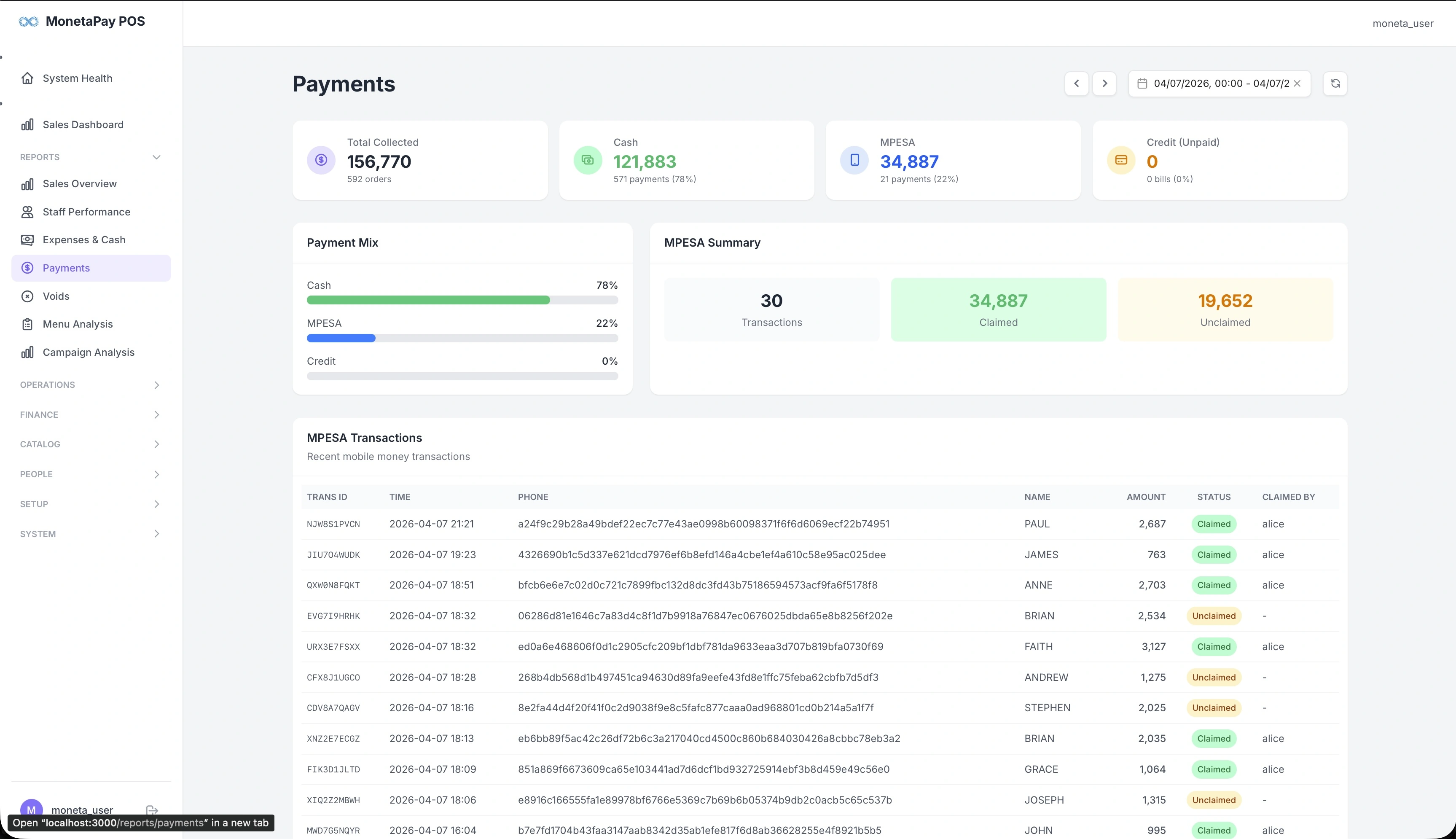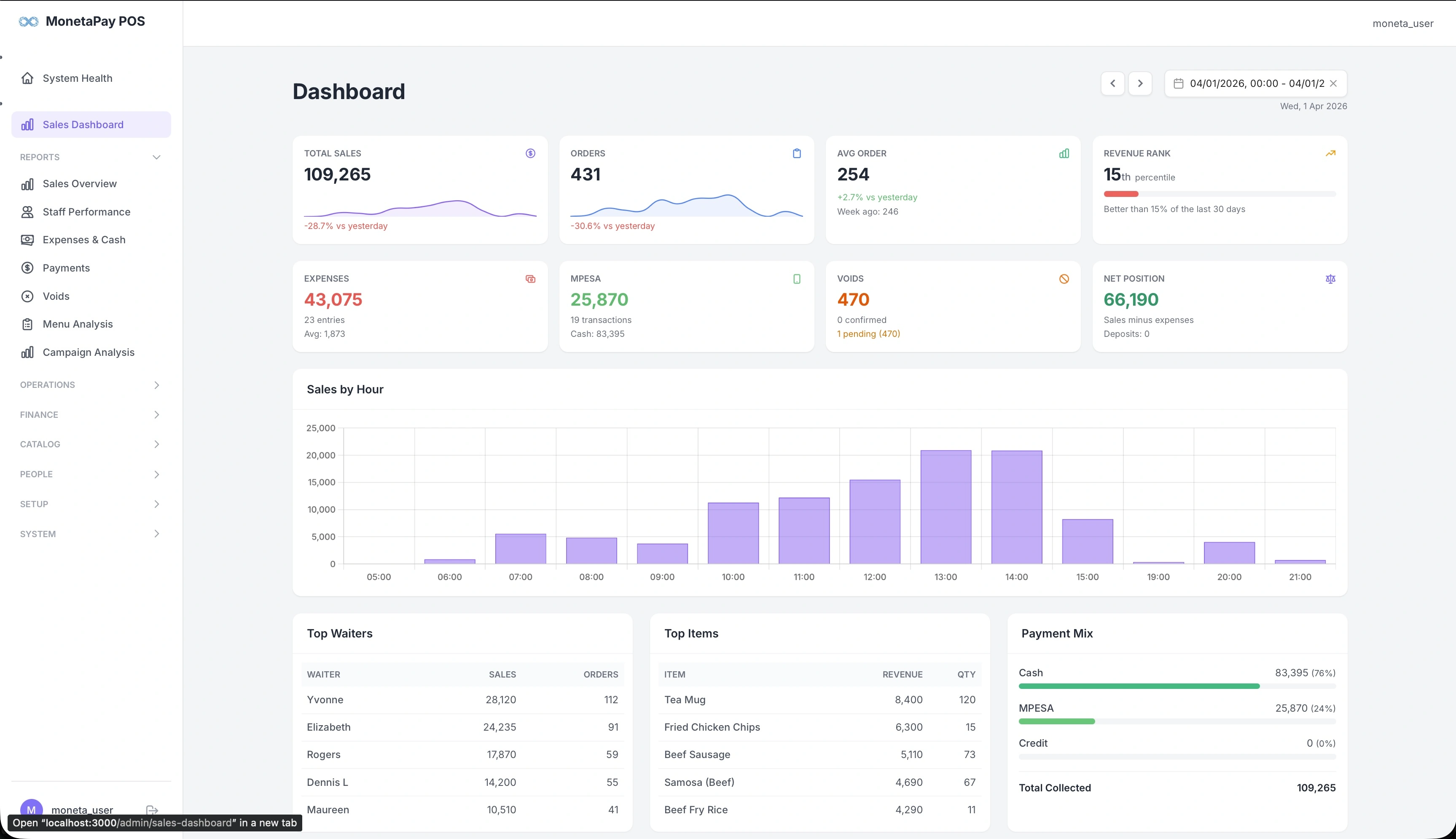 Moneta Pay POS is a restaurant point-of-sale platform built for African restaurants. Originally launched in 2016 as PyPOS and rebranded to Moneta Pay in 2025, the platform serves over 200 restaurants across East Africa with fiscal compliance for Kenya (KRA eTIMS), Uganda (URA), Zambia (ZRA), Nigeria (FIRS), and the UAE (FTA). Core capabilities include keyboard-first ordering, M-PESA payment reconciliation, real-time waiter performance analytics, smart stock tracking, and secure remote access. Moneta Pay POS is a product of Holocorp Ltd, registered in Nairobi, Kenya.